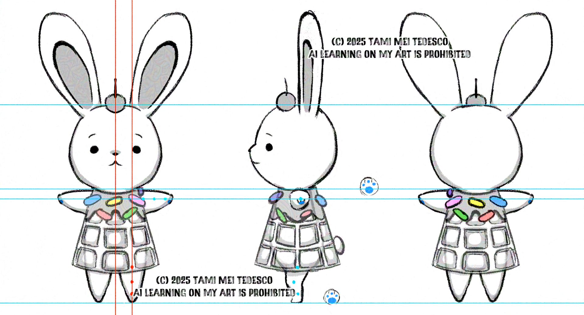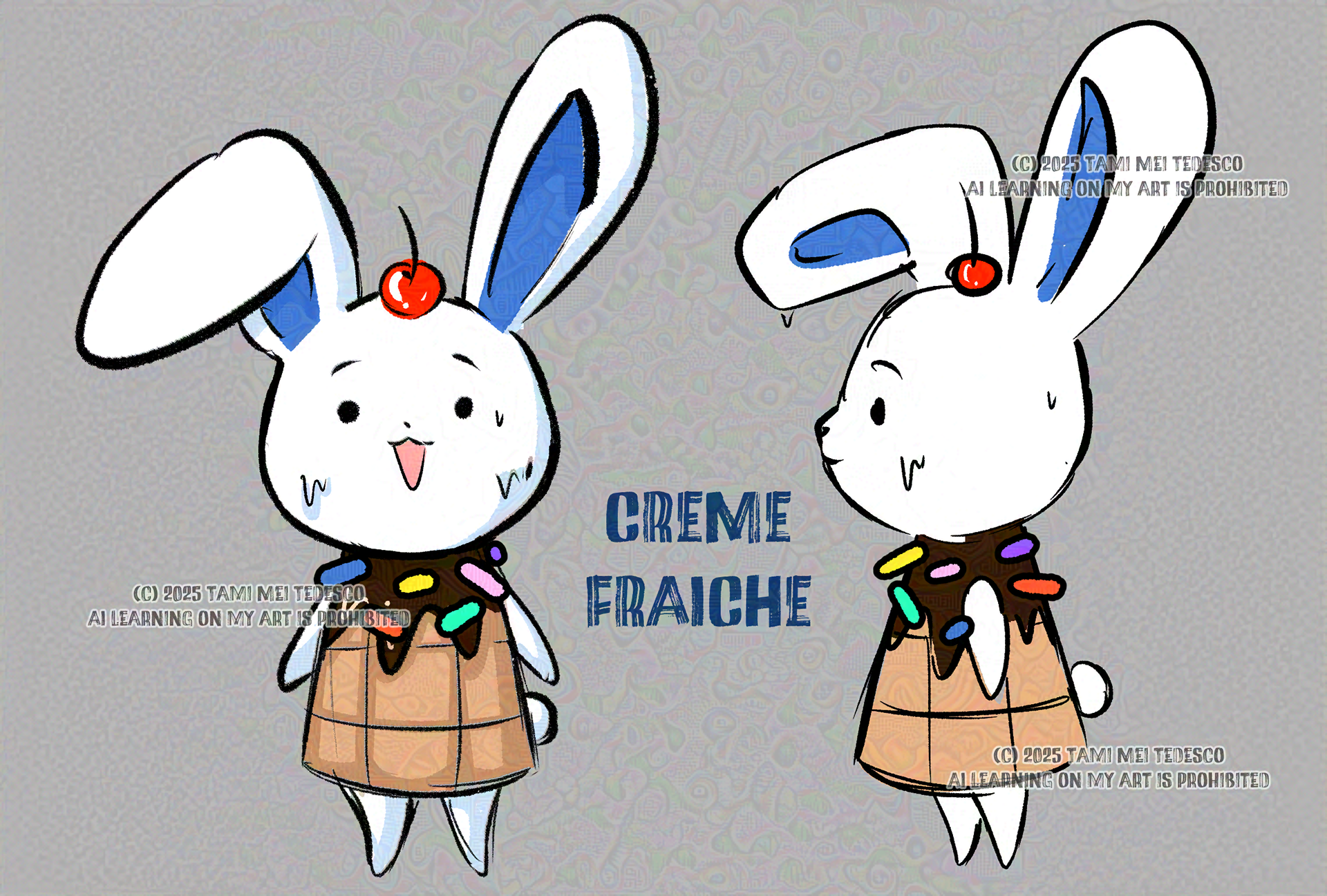 Stylized and orthographic drawings of the lead character of my upcoming 3D animated short film, Creme Fraiche Bakes a Cake || (Photoshop, 2025)